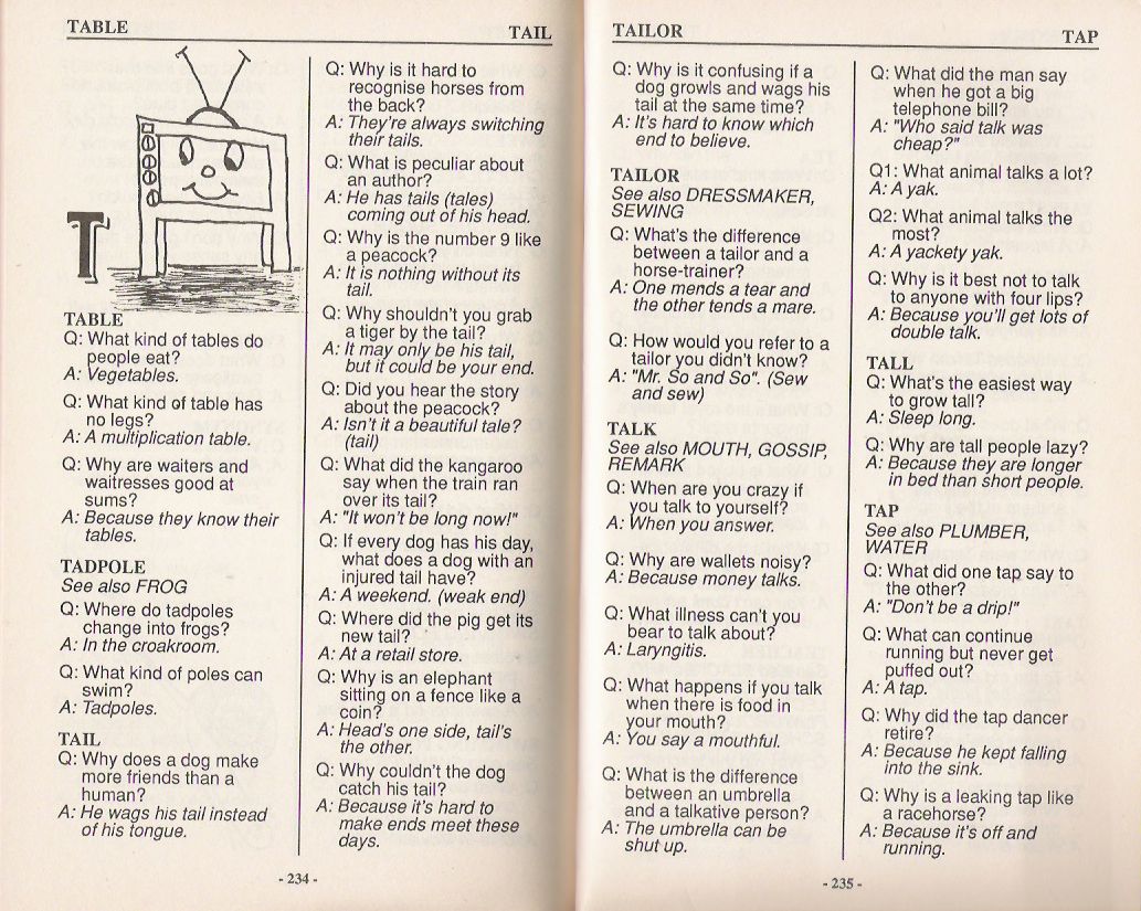 An entertaining encyclopedia of riddles for all ages, with a quick-reference rear index of riddle subjects